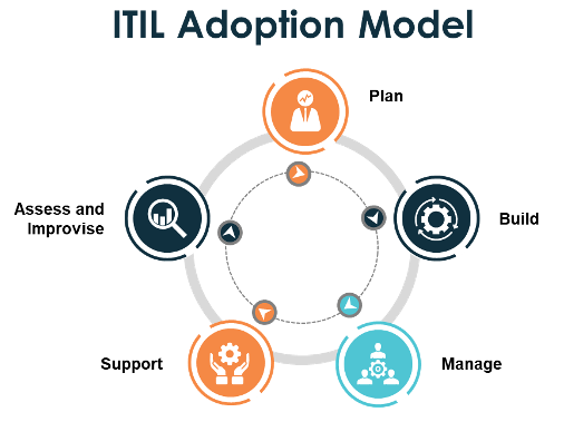 The model elaborates the various interrelated processes and function for basic ITIL adoption, assessing and improvising the current processes and continuously planning for improvements based upon feedback and necessary business requirements. The adoption starts with Planning the service according to the business need then Building the service with defined processes which in turn helps in maintaining the balance of disruptions and the later Manage those services with proper Support & Monitoring with the help of better tools for improving the service.
