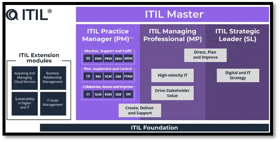 ITIL 4 MANAGING PROFESSIONAL, ITIL 4 STRATEGIC LEADER, ITIL 4 ITIL 4 PRACTICE MANAGER, EXTENSION MODULES and ITIL4 MASTER